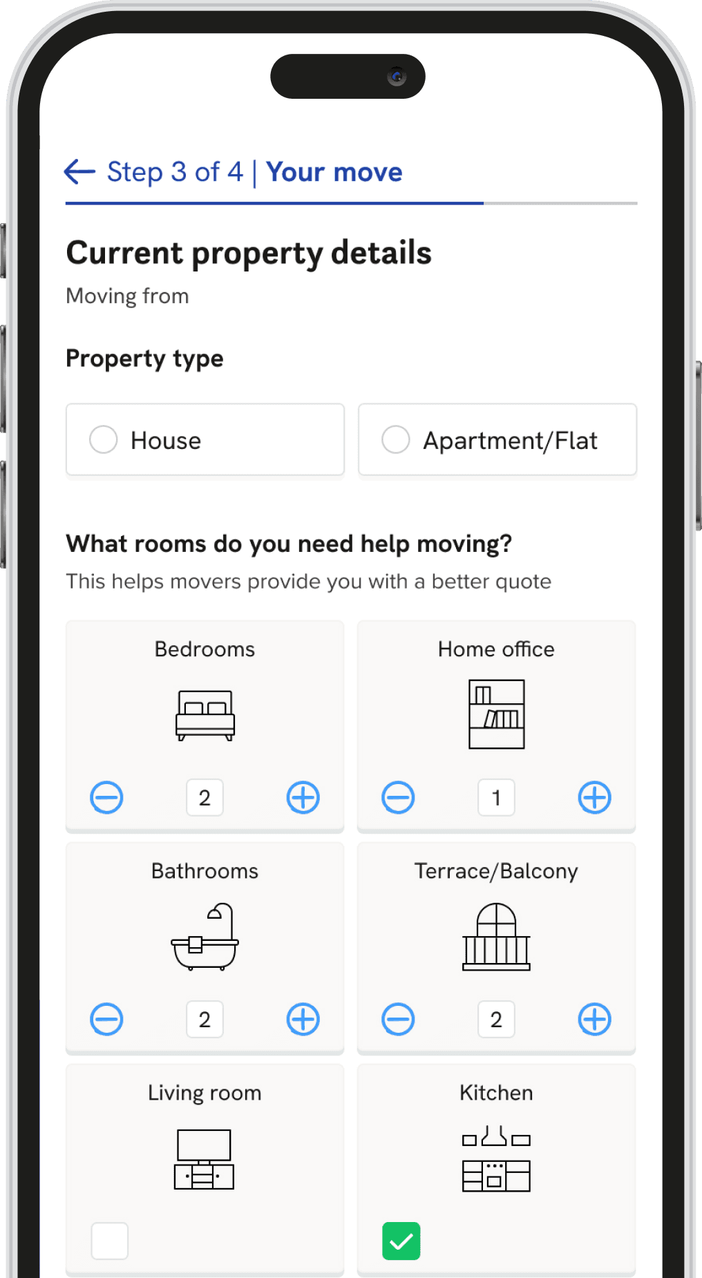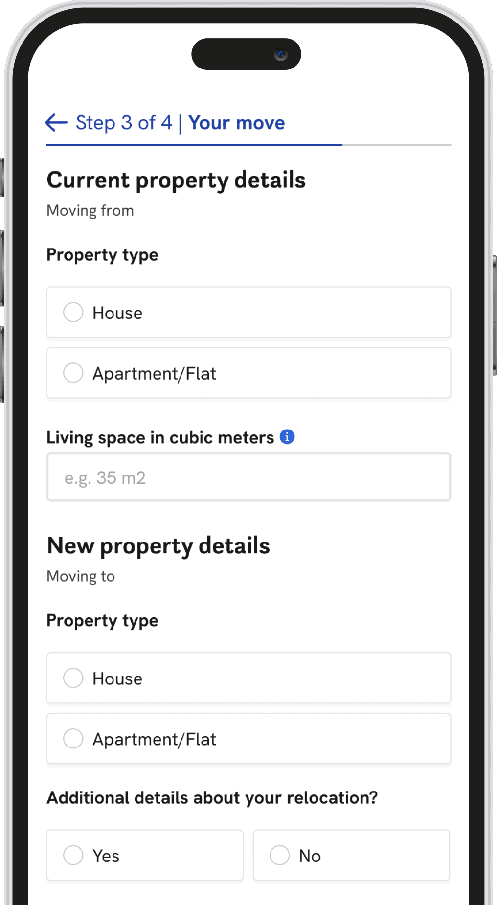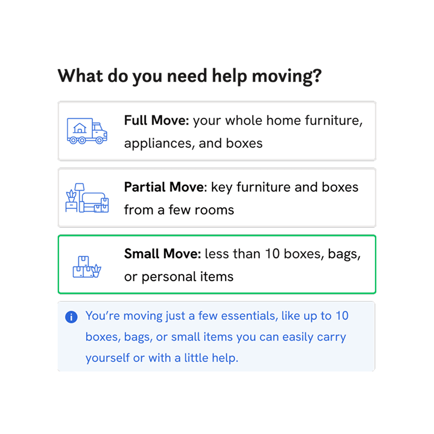 We ran an A/B/C test. Users selected move size (big, medium, small), then: Variant B asked for cubic meters, Variant C asked for room type. Small moves followed a different path, an open-text item list.