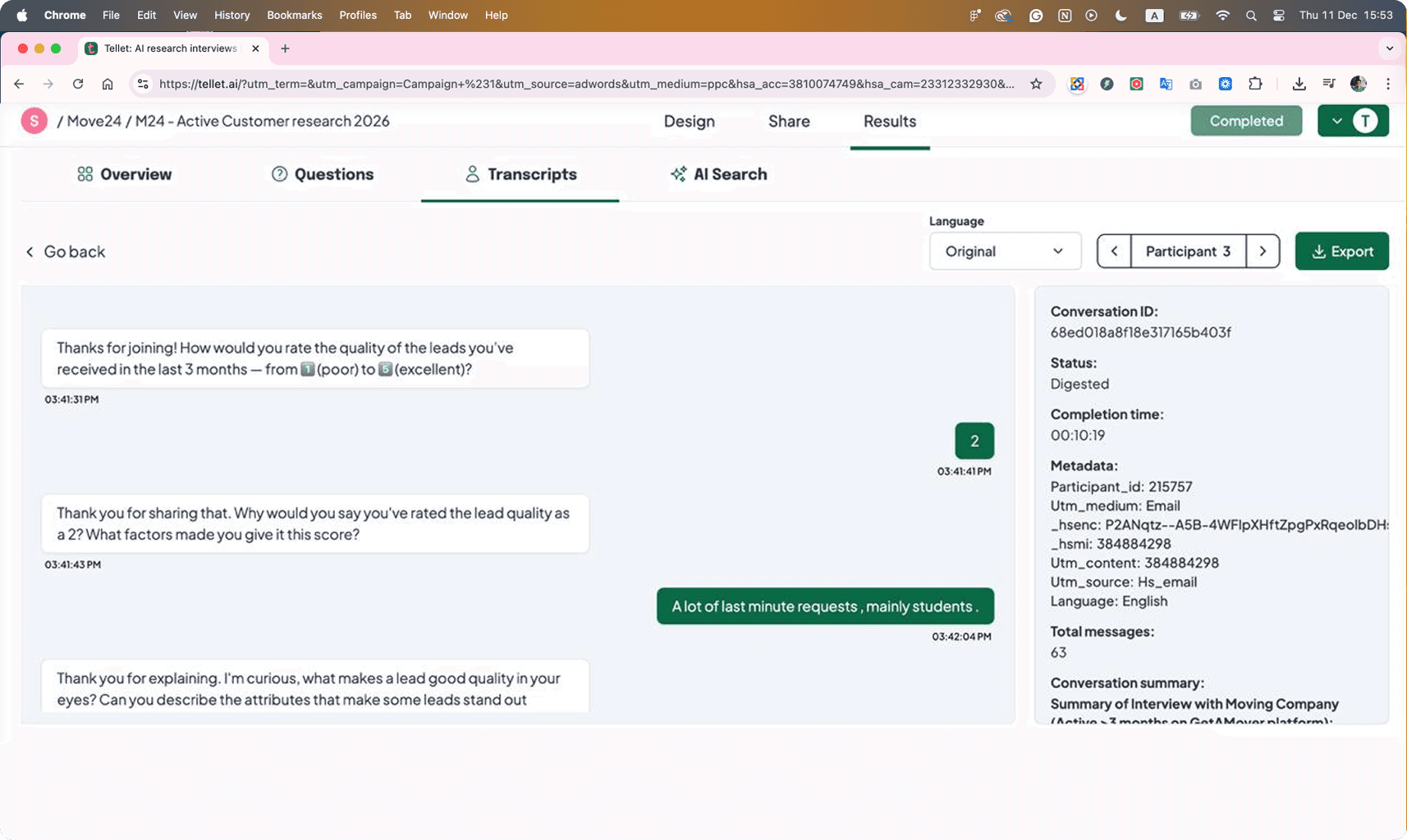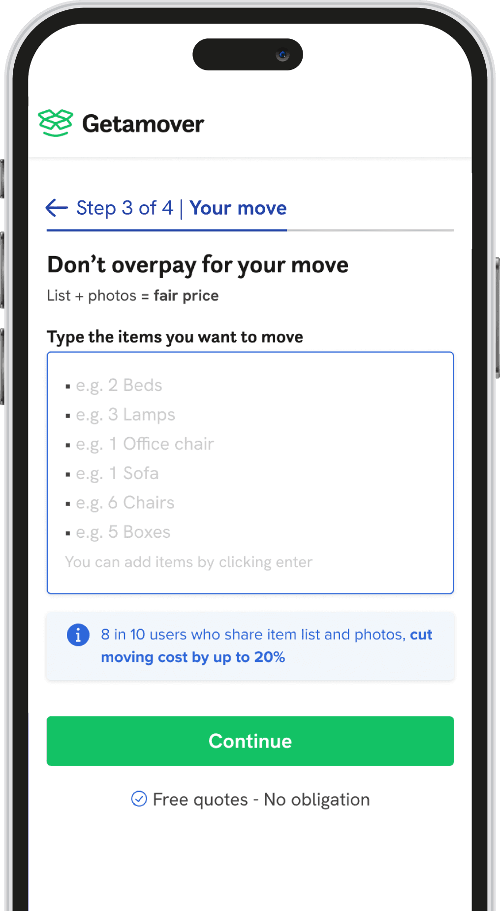 I interviewed moving companies to understand what information they actually needed. They required accurate room counts and item lists to calculate volume (m³), enabling them to price competitively and win on speed. I defined the research strategy with the head of product: five markets, ~100 participants per market, starting without incentives to measure natural responses.